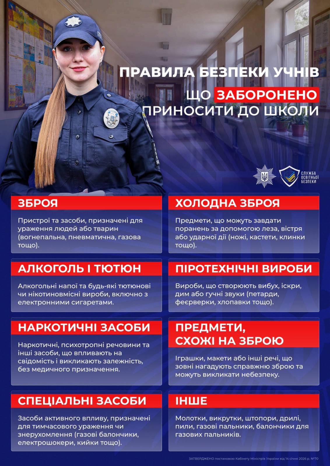 Памʼятку підготовлено відповідно до Постанови Кабінету Міністрів України від 14 січня 2026 року № 70, якою визначено перелік предметів і речовин, заборонених для принесення та перебування у закладах освіти.